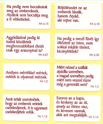 64 különböző ige a Hegyi beszédből, 20×35 mm-es öntapadó matricákon.