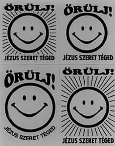 Egy lapon négy db „Örülj! Jézus szeret téged” feliratú matrica.